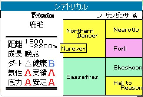 しかしダンスパートナーから2列目「スタミナ+スピード」の印を奪っていることから、気性と勝負根性が著しく低かったと想定される。