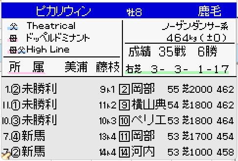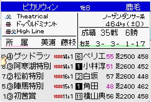 今回は自家生産馬のピカリフローラルで検証します。