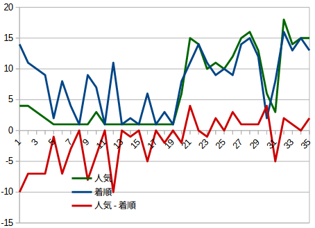 少し分かり難いグラフだが、赤線が「人気ー着順」を表しており、下振れするほど人気なのに着順を落としていることになる。一番左がデビュー戦になるが、13戦目以降比較的安定した結果を残している。