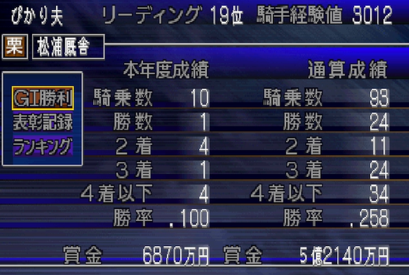 10戦して1勝と、勝率はイマイチも幸先よく重賞制覇。また人気薄での上位入線が多く、調教師からの信頼も大幅にアップした。特に林調教師(64⇒73)や芦口調教師(55⇒63)。