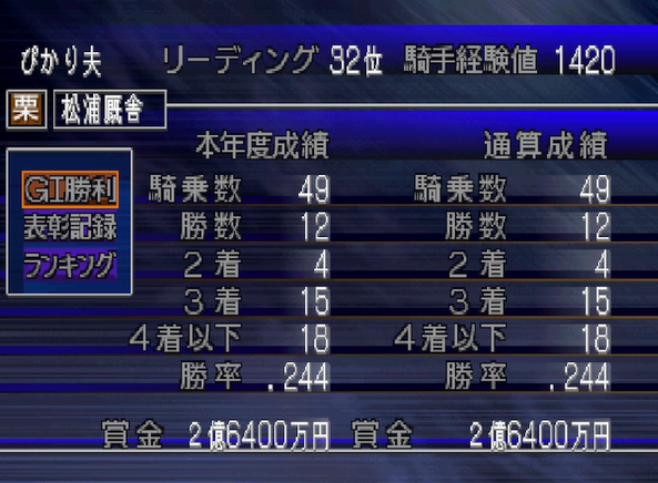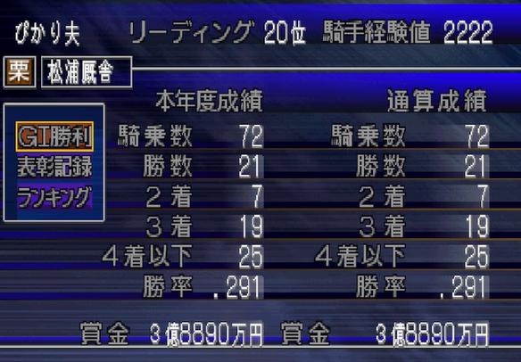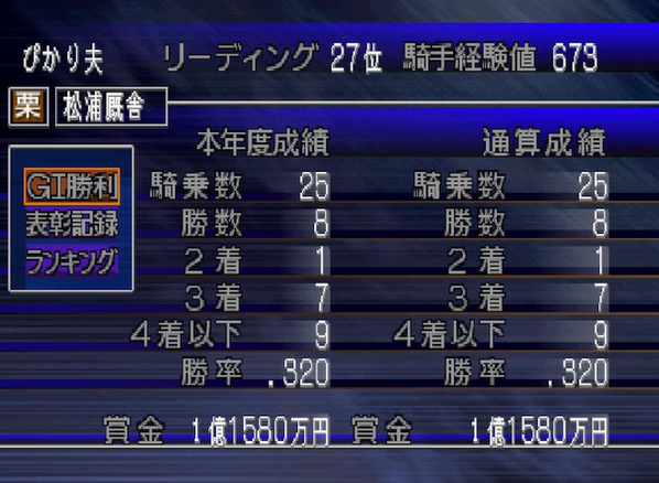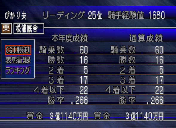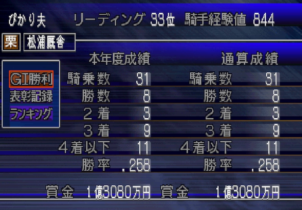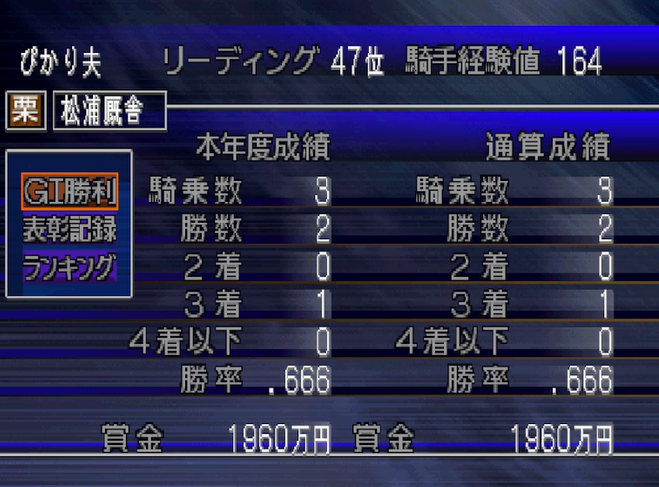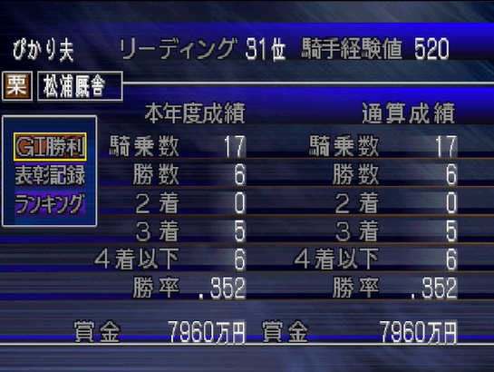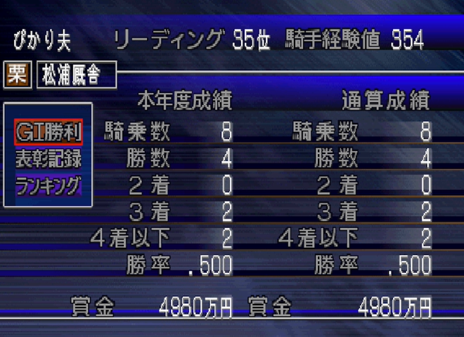 勝率は3割5分2厘と、4月末の勝率5割はキープできなかった。まぁ、これが本来の姿って感じ。早くお手馬を手に入れたい。
