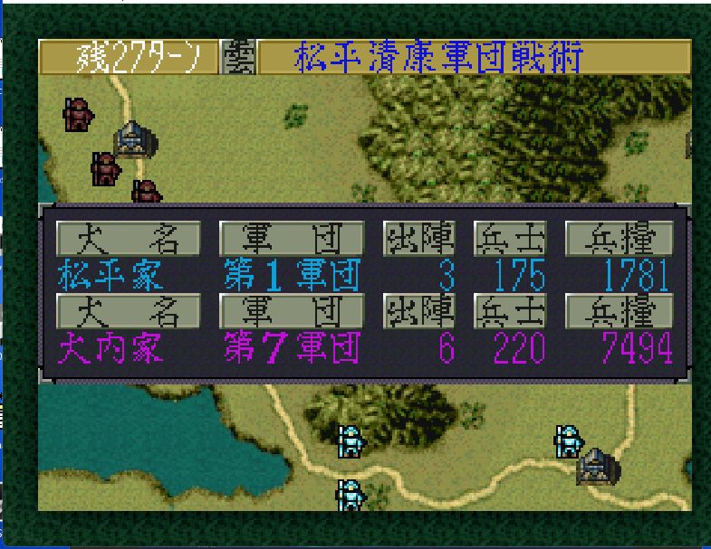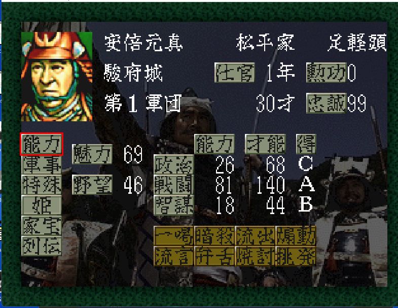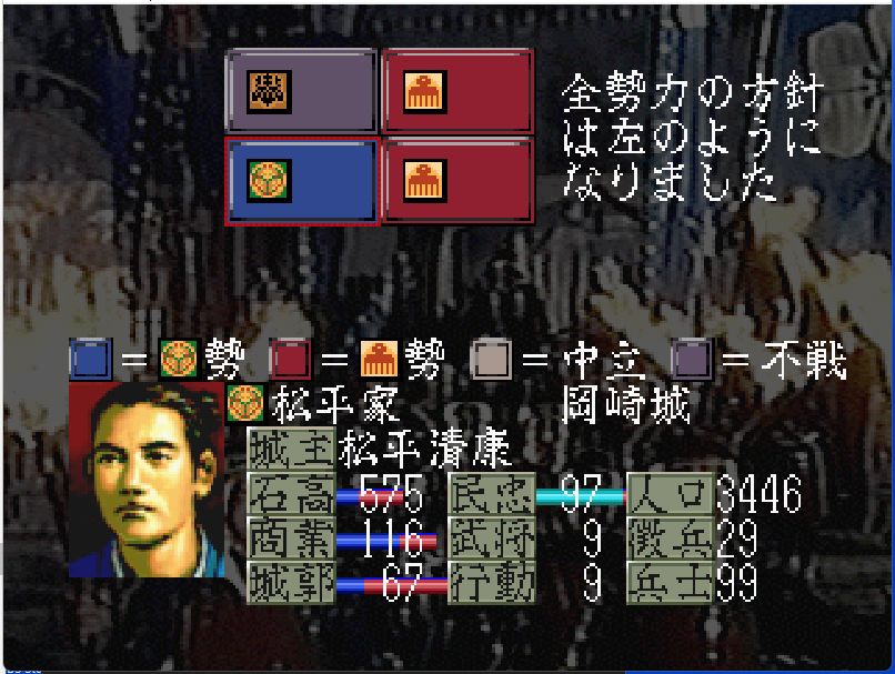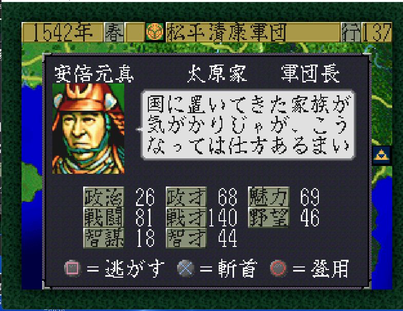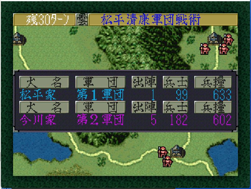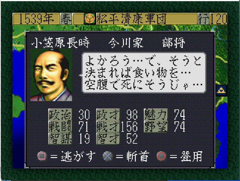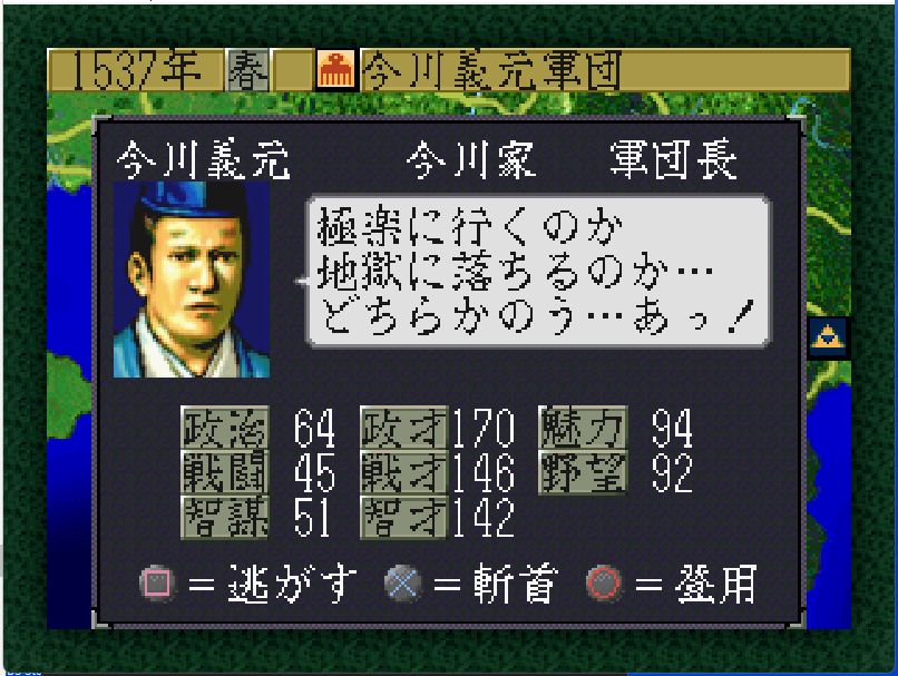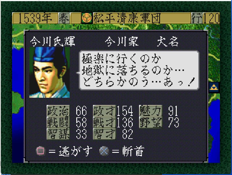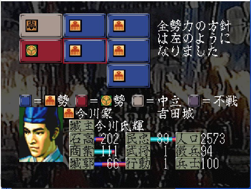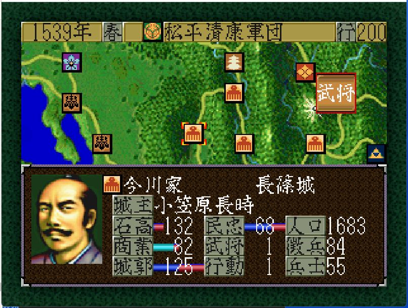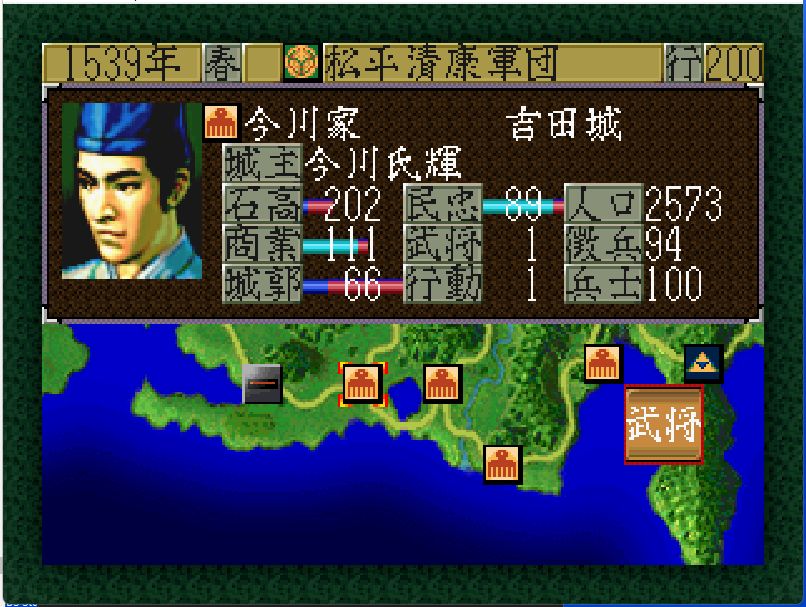 今川家も弱体化しており、高天神城・駿府城には部将3名しかおらず兵力40の安倍元真(戦闘81)しか戦力となるような部将がいない。