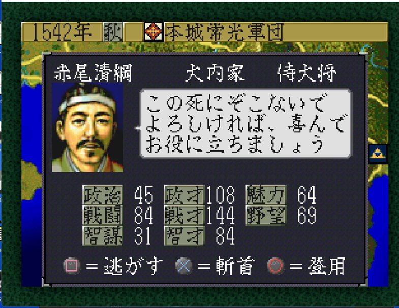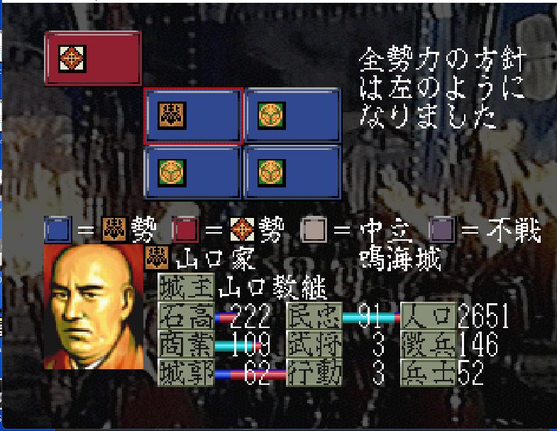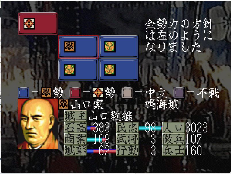1542年・秋の山口家(旧北畠家)第一次防衛戦にて、大内家の有力部将を4名配下にできたことで、守りつつ東にも進出できる足掛かりを作れそうだ。