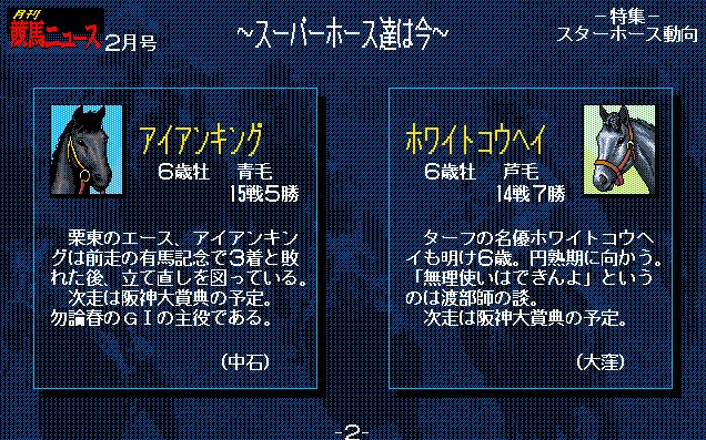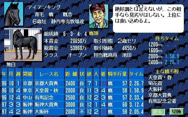 2番人気はアイアンキング。こちらは、前走大阪杯を勝利しているものの、阪神大賞典(3月3週)、大阪杯(4月2週)と使い詰めできている点が不安材料。